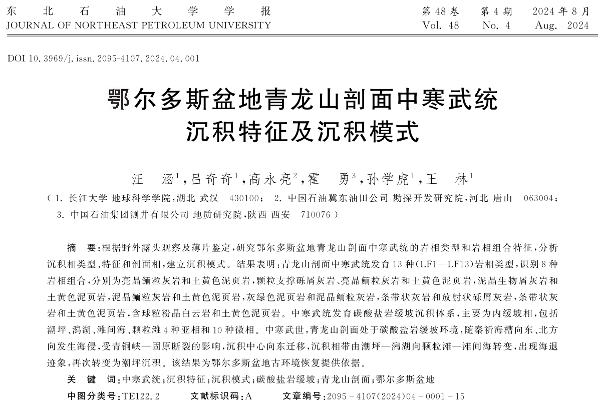2024年8月15日,bevitor伟德22级硕士研究生汪涵在《东北石油大学学报》上发表题为“鄂尔多斯盆地青龙山剖面中寒武统沉积特征及沉积模式”的研究论文,bevitor伟德为论文第一署名单位,硕士研究生汪涵为论文第一作者,其导师吕奇奇副教授为该文通讯作者。