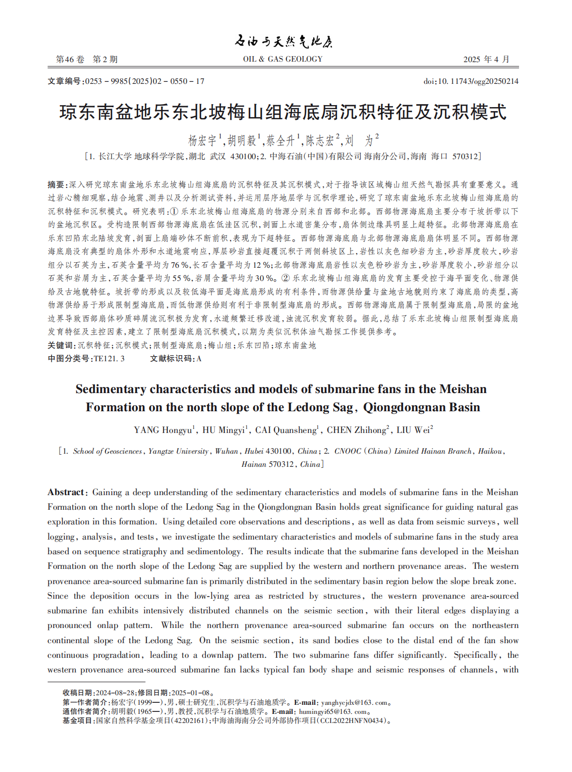 bevitor伟德研究生杨宏宇以第一作者身份在北大核心期刊(EI)《石油与天然气地质》上发表题为“琼东南盆地乐东北坡梅山组海底扇沉积特征及沉积模式”的研究论文,bevitor伟德为论文第一署名单位,导师胡明毅教授为通讯作者。