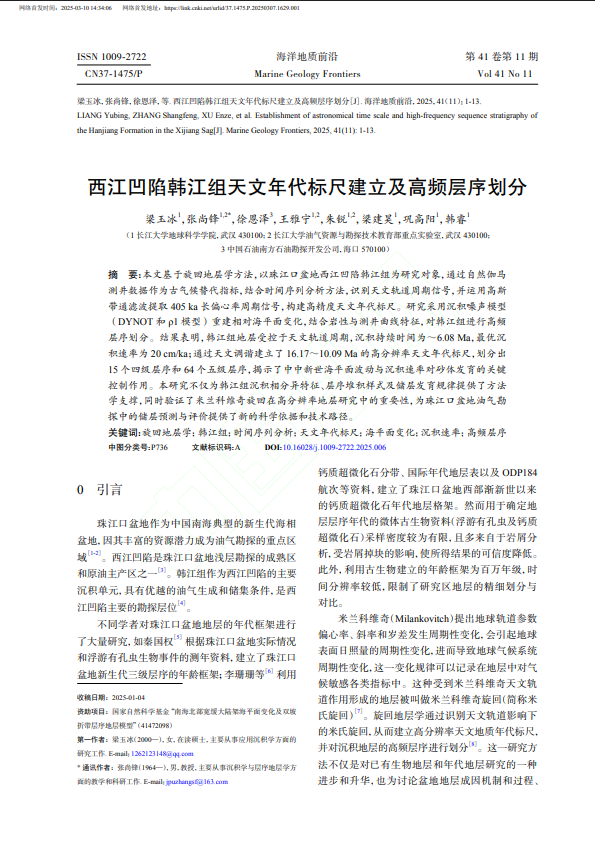 bevitor伟德硕士生梁玉冰在《海洋地质前沿》发表题为“西江凹陷韩江组天文年代标尺建立及高频层序划分”的研究论文。bevitor伟德为论文第一署名单位,通讯作者为张尚锋教授。