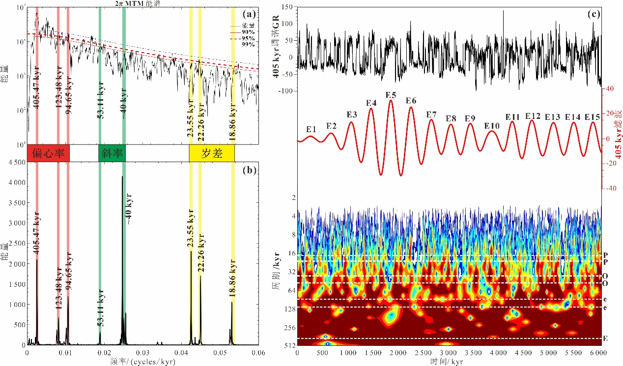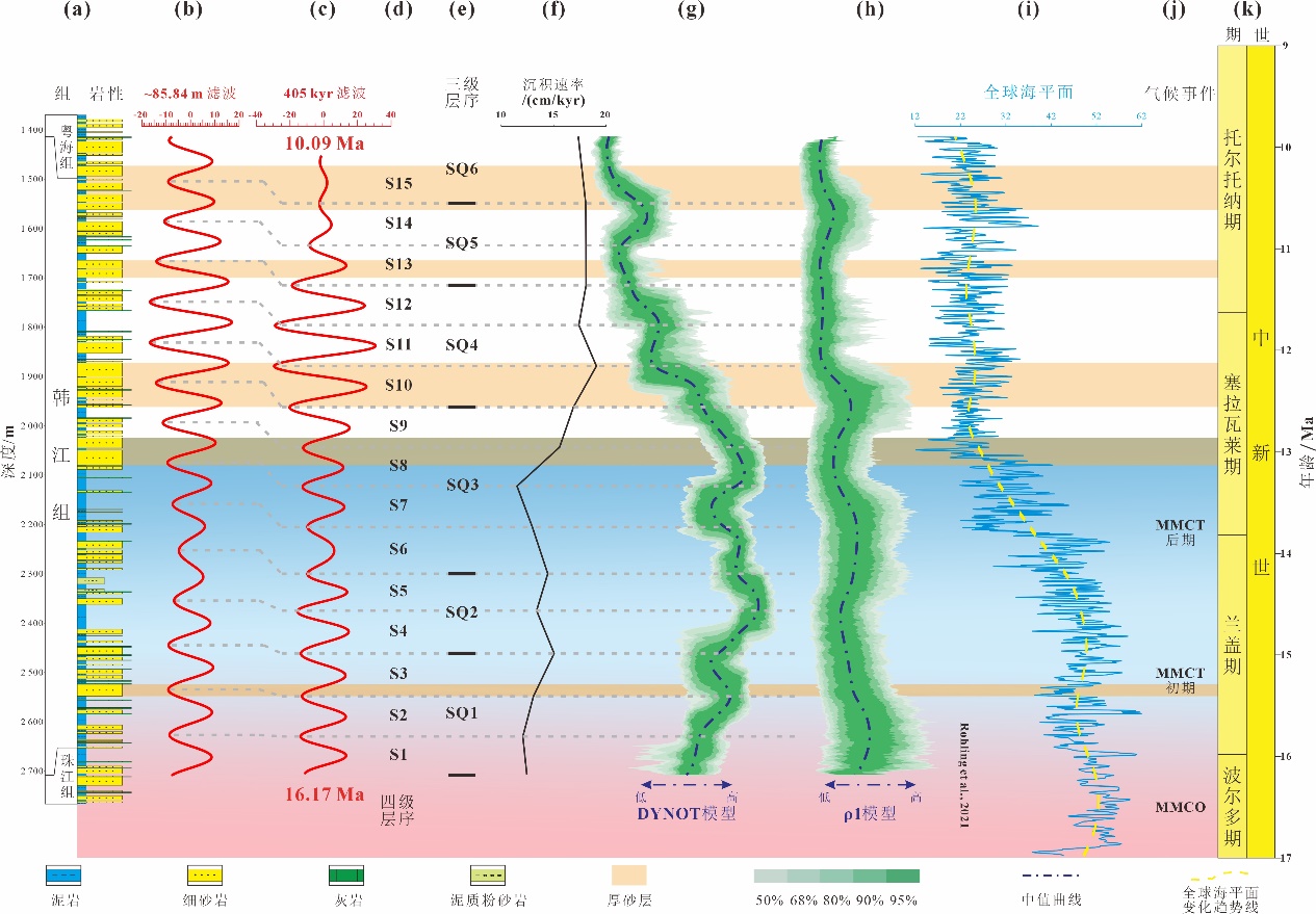 本文基于旋回地层学方法,以珠江口盆地西江凹陷韩江组为研究对象,通过自然伽马测井数据作为古气候替代指标,结合时间序列分析方法,识别天文轨道周期信号,并运用高斯带通滤波提取405 ka长偏心率周期信号,构建高精度天文年代标尺。研究采用沉积噪声模型(DYNOT和ρ1模型)重建相对海平面变化,结合岩性与测井曲线特征,对韩江组进行高频层序划分。结果表明,韩江组地层受控于天文轨道周期,沉积持续时间为~6.08 Ma,最优沉积速率为20 cm/ka;通过天文调谐建立了16.17~10.09 Ma的高分辨率天文年代标尺,划分出15个四级层序和64个五级层序,揭示了中中新世海平面波动与沉积速率对砂体发育的关键控制作用。本研究不仅为韩江组沉积相分异特征、层序堆积样式及储层发育规律提供了方法学支撑,同时验证了米兰科维奇旋回在高分辨率地层研究中的重要性,为珠江口盆地油气勘探中的储层预测与评价提供了新的科学依据和技术路径。