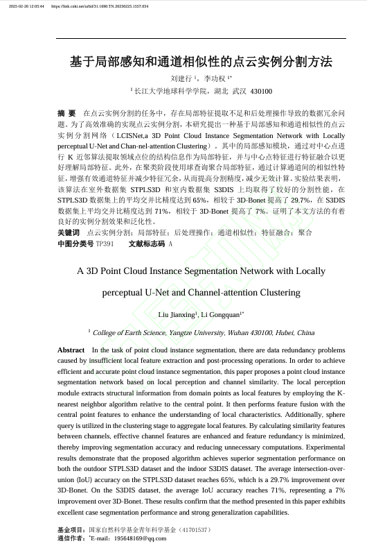 bevitor伟德硕士生刘建行在《激光与光电子学进展》发表题为“基于局部感知和通道相似性的点云实例分割方法”的研究论文。bevitor伟德为论文第一署名单位,硕士生刘建行为第一作者,教授李功权为论文通讯作者。