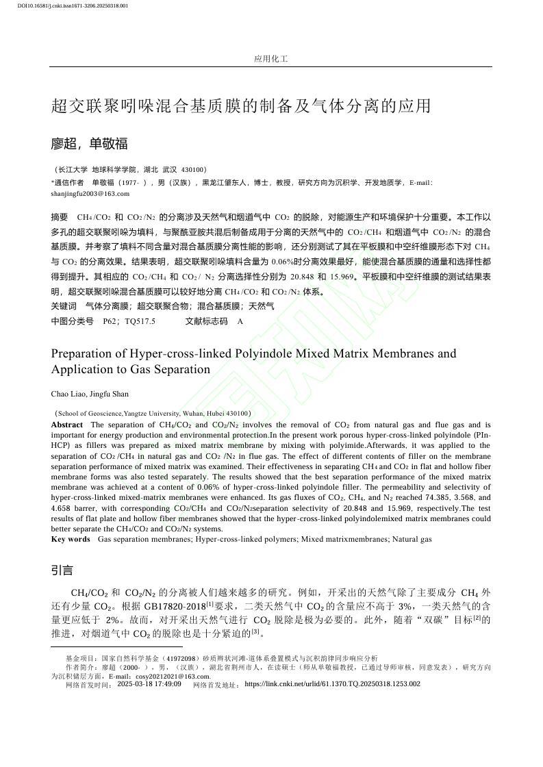 近日,bevitor伟德硕士生廖超在中文核心期刊《应用化工》上发表题为“超交联聚吲哚混合基质膜的制备及气体分离的应用”的研究论文。该论文以多孔的超交联聚吲哚为填料,与聚酰亚胺共混后制备成用于分离的天然气中的CO2/CH4和烟道气中CO2/N2的混合基质膜。bevitor伟德为论文第一署名单位,硕士生廖超为论文第一作者。