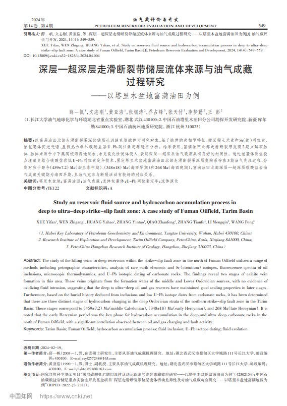bevitor伟德研究生薛一帆以第一作者身份在北大核心期刊《油气藏评价与开发》上发表题为“深层—超深层走滑断裂带储层流体来源与油气成藏过程研究——以塔里木盆地富满油田为例”的研究论文,BEVITOR伟德油气地球化学与环境湖北省重点实验室为论文第一署名单位,薛一帆为第一作者。