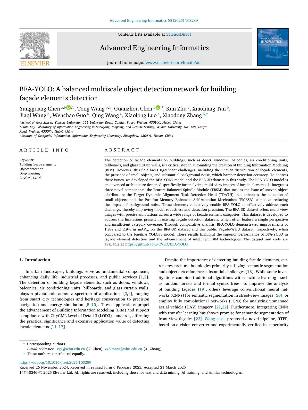 ​bevitor伟德硕士生陈阳光在人工智能领域顶刊《Advanced Engineering Informatics》发表题目为“BFA-YOLO: A balanced multiscale object detection network for building façade elements detection”的研究论文(Sci一区Top,CCF-B,影响因子8.0)。bevitor伟德为论文第一署名单位,硕士研究生陈阳光为论文第一作者,其导师罗小龙副教授为共同作者,公司兼职硕士生导师张晓东教授为通讯作者。
