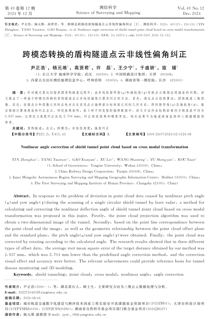 bevitor伟德研究生尹正浩以第一作者身份在北大核心期刊《测绘科学》上发表题为“跨模态转换的盾构隧道点云非线性偏角纠正”的研究论文,bevitor伟德为论文第一署名单位,研究生尹正浩为第一作者,副教授杨元维为论文通讯作者。