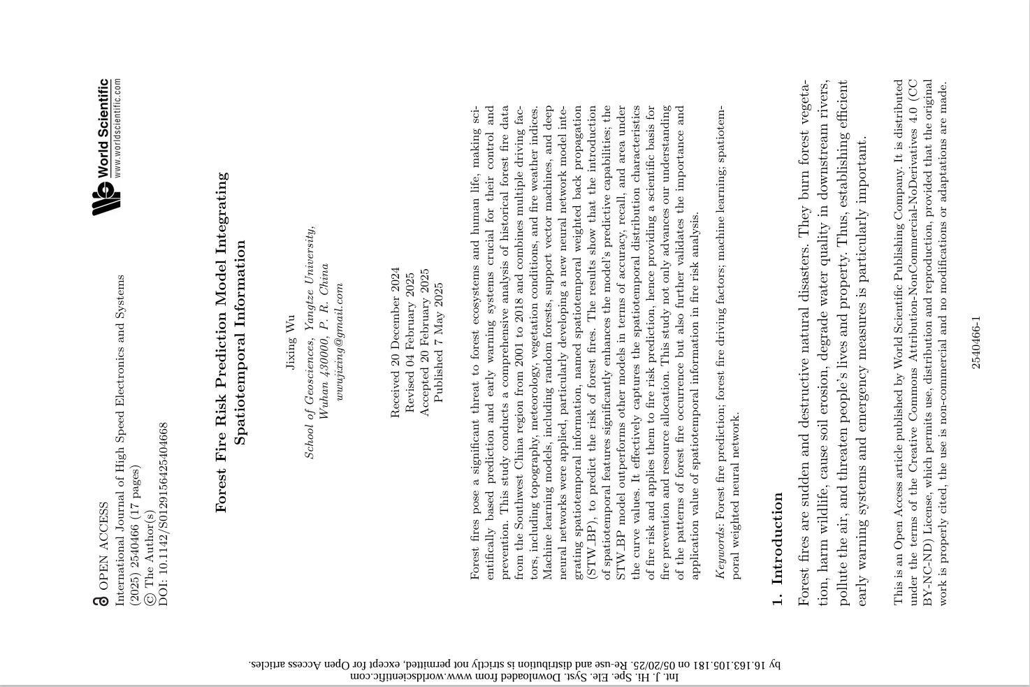 bevitor伟德硕士生吴集星在EI收录期刊《International Journal of High Speed Electronics and Systems》上发表题为“Forest Fire Risk Prediction Model Integrating Spatiotemporal Information”的研究论文。bevitor伟德为论文第一署名单位,吴集星为论文第一作者。