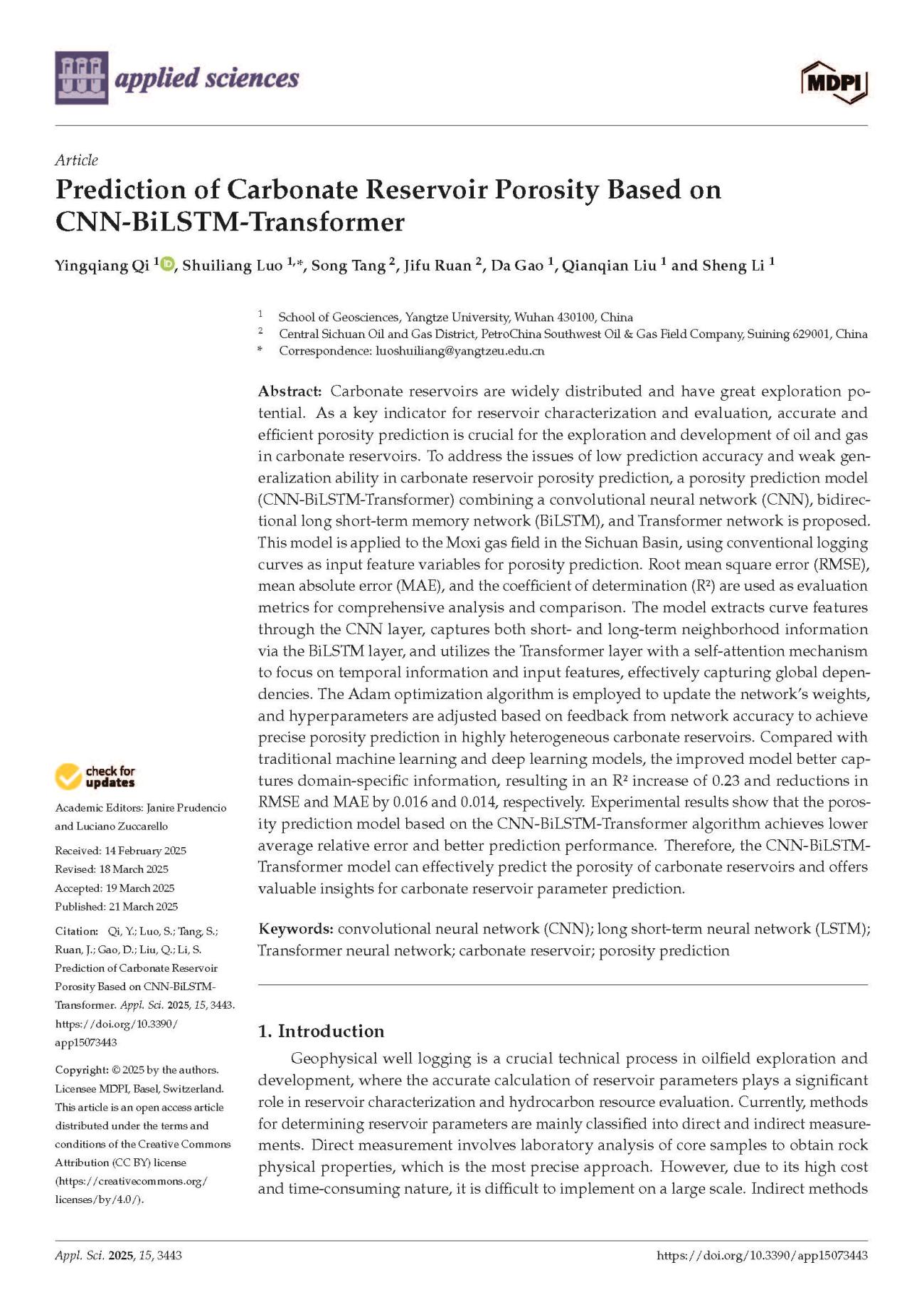 bevitor伟德硕士生漆影强在SCI收录期刊《Applied Sciences》上发表题为“Prediction of Carbonate Reservoir Porosity Based on CNN-BiLSTM-Transformer”的研究论文。bevitor伟德为论文第一署名单位,罗水亮副教授为第一通讯作者,论文由中国青年基金国家自然科学基金项目资助。