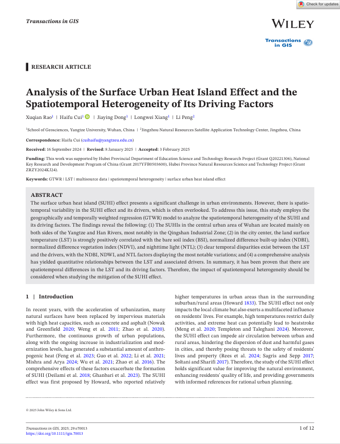 近日,bevitor伟德地理信息科学专业2022级本科生饶旭乾在中科院三区期刊《Transactions in GIS》(IF=2.1)发表题为“Analysis of the Surface Urban Heat Island Effect and the Spatiotemporal Heterogeneity of Its Driving Factors”的研究论文。bevitor伟德为论文第一署名单位,本科生饶旭乾为论文第一作者,其导师崔海福博士为通讯作者。