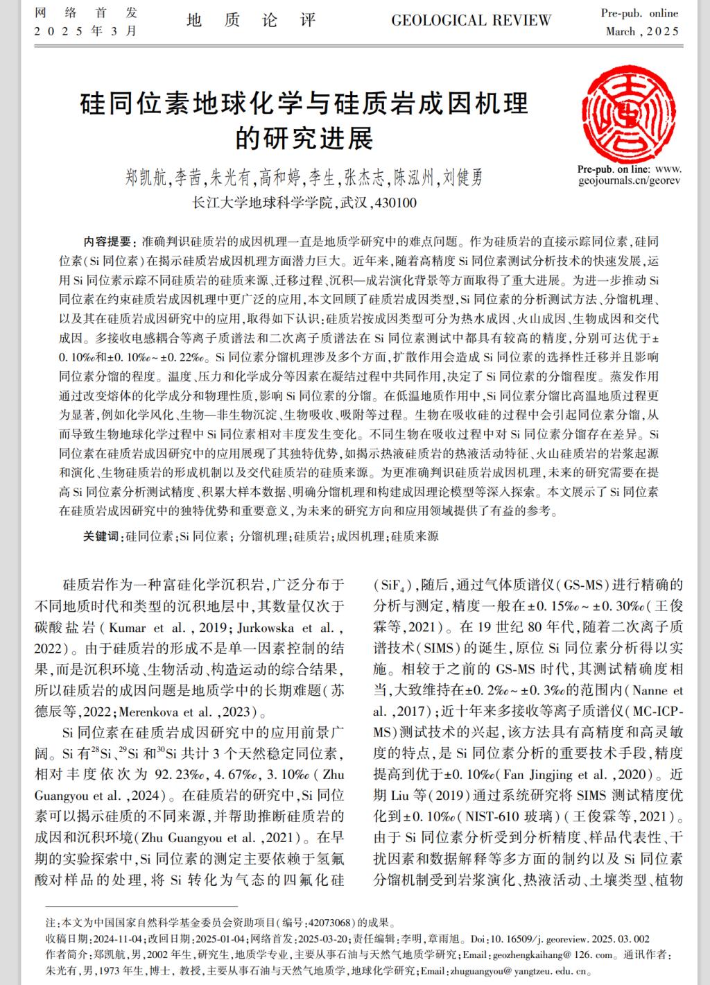近日,bevitor伟德地质学专业2024级硕士生郑凯航在中文核心期刊《地质论评》发表题为“硅同位素地球化学与硅质岩成因机理的研究进展”的研究论文。bevitor伟德为论文第一署名单位,硕士生郑凯航为论文第一作者,其导师朱光有教授为通讯作者。