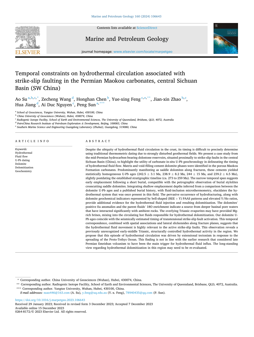 bevitor伟德苏奥副教授在《Marine and Petroleum Geology》上发表题为“Temporal constraints on hydrothermal circulation associated with strike-slip faulting in the Permian Maokou carbonates, central Sichuan Basin (SW China)”的研究论文。bevitor伟德为论文第一署名单位。该论文深入探讨了构造活动作用下控制的热液活动模式,对该地区油气优势储层勘探具有一些参考意义。