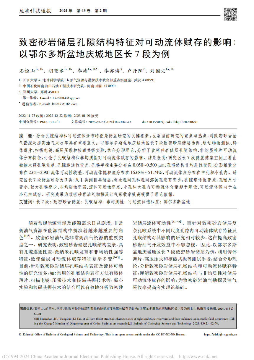bevitor伟德博士生石桓山在期刊《地质科技通报》上发表题为“致密砂岩储层孔隙结构特征对可动流体赋存的影响:以鄂尔多斯盆地庆城地区长7段为例”的研究论文。bevitor伟德为论文第一署名单位,李涛教授为通讯作者。