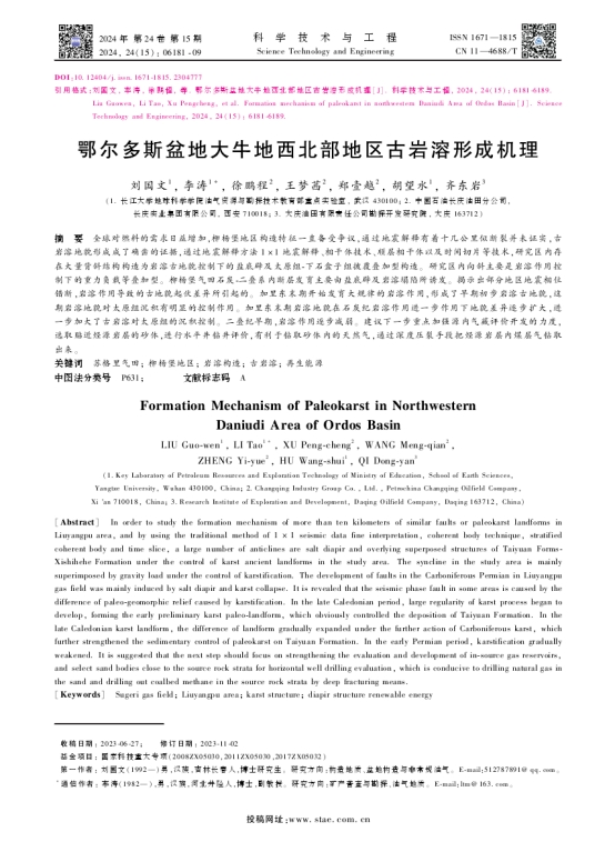 bevitor伟德博士生刘国文在《科学技术与工程》上发表题为“鄂尔多斯盆地大牛地西北部地区古岩溶形成机理”的研究论文。bevitor伟德为论文第一署名单位,博士生刘国文为论文第一作者,副教授李涛为通讯作者。