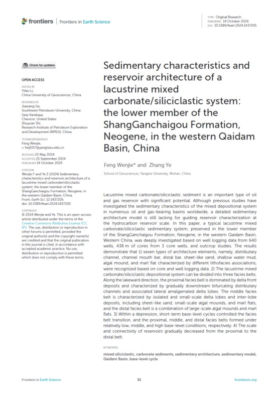 bevitor伟德教师冯文杰在《Frontiers in Earth Science》上发表题为“Sedimentary characteristics and reservoir architecture of a lacustrine mixed carbonate/siliciclastic system: the lower member of the ShangGanchaigou Formation, Neogene, in the western Qaidam Basin, China”的研究论文。该论文针对柴达木盆地西部地区新近系上干柴沟组下段混积体系开展野外露头无人机倾斜摄影建模与解剖、地下储层表征,明确了油田开发尺度下,混积体系沉积特征与沉积模式。