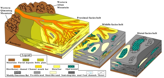 研究表明:①根据岩心和测井数据,识别出了七种类型的构型元素,即分流河道、河口坝、远砂坝、席状砂、浅湖泥、藻丘及泥灰坪;②湖相碳酸盐岩/碎屑岩混积体系可以分为三个相带,在湖泊方向上,近端相带主要由三角洲前缘沉积物构成,其特征是逐级分枝的分流河道和相关的侧向拼接的三角洲朵体。中间相带的特点是由孤立的小规模三角洲朵体和朵体间沉积物组成,包括席状砂、小规模的藻丘和泥灰坪;而远端相带则是大规模藻丘和泥灰坪组成;③坳陷盆地短期基准面旋回控制着相带的转换,近端、中段和远端相带分别在相对较低、中等和较高的基准面条件下形成。