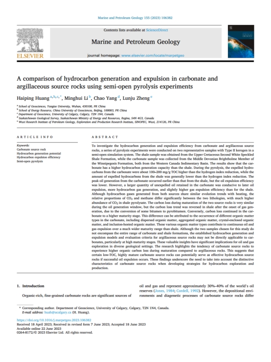 bevitor伟德黄海平教授以第一作者身份在《Marine and Petroleum Geology》期刊发表题为“A comparison of hydrocarbon generation and expulsion in carbonate and argillaceous source rocks using semi-open pyrolysis experiments”的研究论文,bevitor伟德为论文第一署名单位。