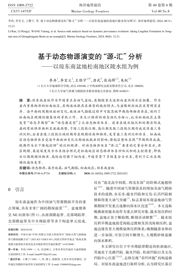 bevitor伟德硕士生李冉在《海洋地质前沿》发表题为“基于动态物源演变的“源-汇”分析—以琼东南盆地松南地区陵水组为例”的研究论文。bevitor伟德为论文第一署名单位,通讯作者为王雅宁副教授。