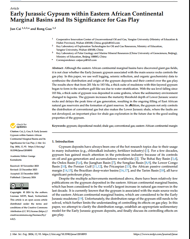 bevitor伟德蔡俊副教授在《JMSE》上发表题为“Early Jurassic Gypsum within Eastern African Continental Marginal Basins and Its Significance for Gas Play”的研究论文。该研究通过基于钻测井和地震资料,结合地球化学数据,分析了转换型陆缘盆地膏盐岩分布特征、成因及其对油气分布的控制作用。研究结果显示在陆间裂谷期的海平面上升阶段,由于水体较深出现盐度分层作用导致薄层膏盐岩析出;随着海平面下降,在地堑控制的洼地形成潟湖环境,蒸发作用的加剧导致了厚层膏盐岩的形成。膏盐岩的发育提升了前转换期烃源岩成熟的阈值,导致大规模生排烃的迟滞,这或许是转换陆缘盆地巨型油气藏形成的重要原因之一。