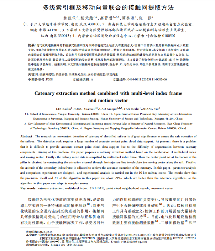 bevitor伟德硕士生林凯伦在测绘领域主流期刊《测绘通报》上发表题为“多级索引框及移动向量联合的接触网提取方法”的研究论文。