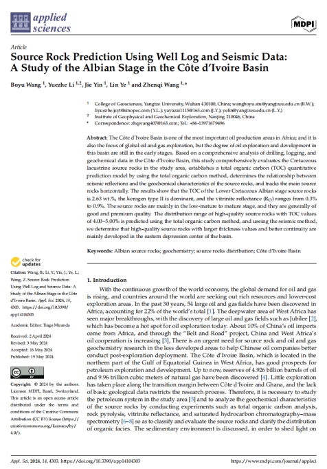bevitor伟德博士生王博宇在《Applied Sciences》上发表题为《Source Rock Prediction Using Well Log and Seismic Data:A Study of the Albian Stage in the Côte d’Ivoire Basin》的研究论文。bevitor伟德为论文第一署名单位,博士生王博宇为论文第一作者,教师王振奇为通讯作者。