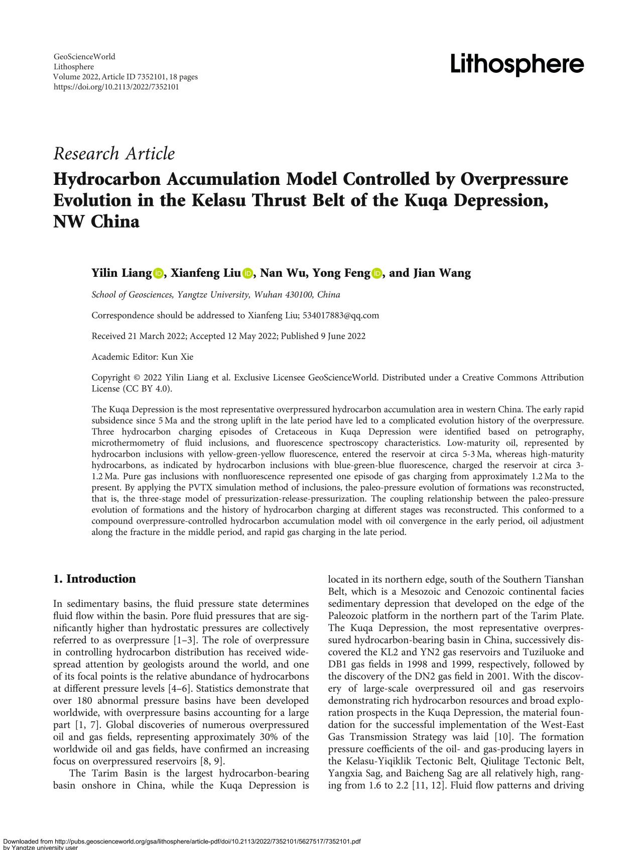 bevitor伟德博士生梁祎琳在《LITHOSPHERE》上发表题为“Hydrocarbon Accumulation Model Controlled by Overpressure Evolution in the Kelasu Thrust Belt of the Kuqa Depression, NW China”的研究论文。bevitor伟德为论文第一署名单位,博士生梁祎琳为论文第一作者,教师刘显凤为通讯作者。