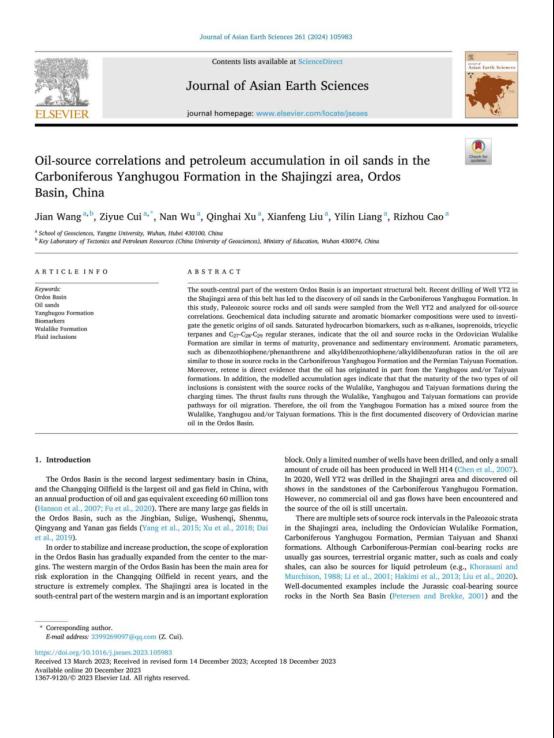 bevitor伟德王健在《Journal of Asian Earth Sciences》发表题为“Oil-source correlations and petroleum accumulation in oil sands in the Carboniferous Yanghugou Formation in the Shajingzi area, Ordos Basin, China”的研究论文。bevitor伟德为论文第一署名单位,教师王健为论文第一作者。