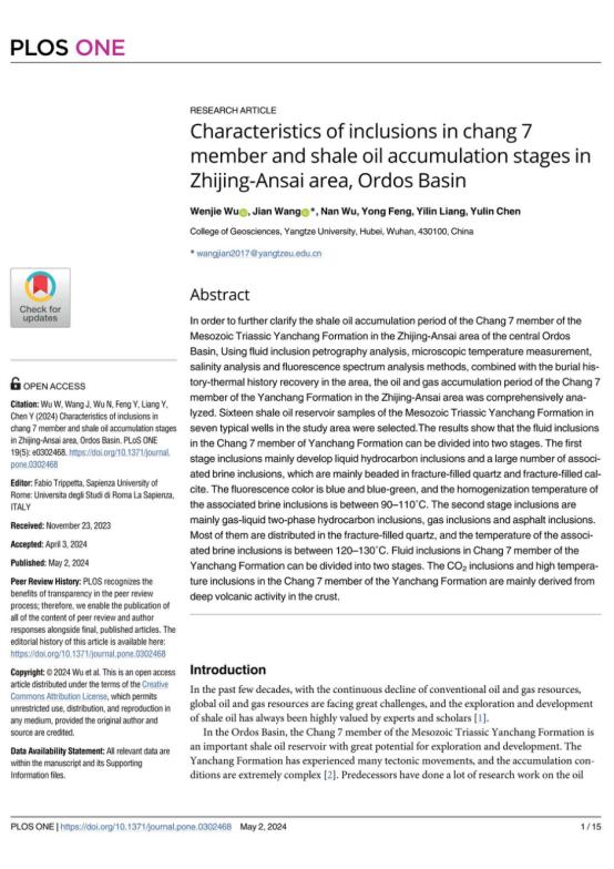 bevitor伟德硕士生吴文杰在《PLOSONE》发表题为“Characteristics of inclusions in chang 7 member and shale oil accumulation stages in Zhijing-Ansai area, Ordos Basin”的研究论文。bevitor伟德为论文第一署名单位,硕士生吴文杰为论文第一作者,教师王健为通讯作者。