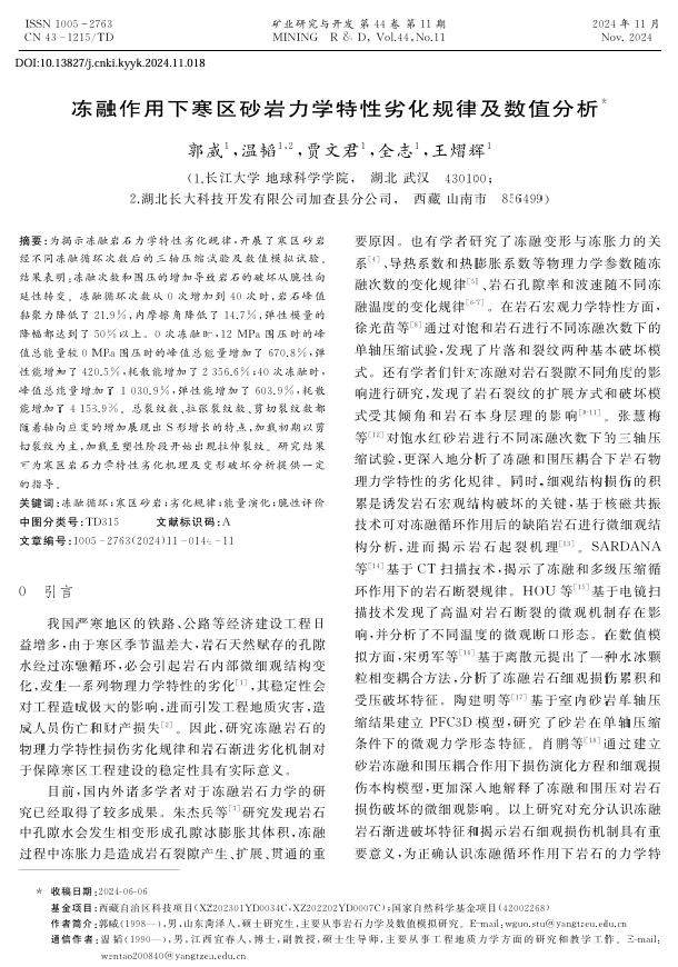 bevitor伟德温韬教授团队长期从事冻融岩石力学、滑坡演化机理及预测与防治、岩土体稳定性评价与数值模拟、岩石力学特性表征、机器学习等方面的研究,团队硕士生郭威在核心期刊《矿业研究与开发》上发表题为《冻融作用下寒区砂岩力学特性劣化规律及数值分析》的研究论文。bevitor伟德为论文第一署名单位,硕士生郭威为论文第一作者,温韬教授为该文通讯作者,本项研究得到西藏自治区科技项目和国家自然科学基金项目共同资助。