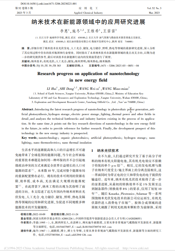 公司硕士生李惠在中文期刊《应用化工》上发表了题为“纳米技术在新能源领域中的应用研究进展”的研究论文。bevitor伟德为论文第一署名单位,研究生李惠为论文第一作者,教师施冬为通讯作者。