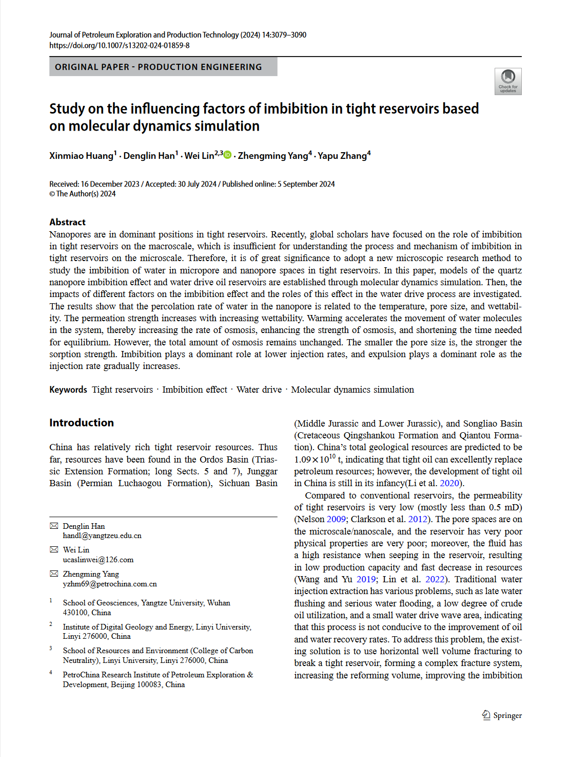 bevitor伟德硕士研究生章黄鑫淼在《Journal of Petroleum Exploration and Production Technology》发表了题为“Study on the influencing factors of imbibition in tight reservoirs based on molecular dynamics simulation”的研究论文,bevitor伟德为论文第一署名单位,黄鑫淼为论文第一作者,韩登林教授、林伟老师、杨正明老师共同为该文通讯作者。