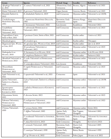 该研究以一块保存有蜚蠊(蟑螂)新物种的琥珀化石标本为研究对象,该标本产自缅甸克钦地区胡康河谷地区,通过U-Pb锆石定年法确认其时代大致属于晚白垩世的塞诺曼阶(Cenomanian)早期,此时期也正是蜚蠊研究的一个重要时期。同时,通过对该标本开展全面的显微成像分析和系统分类学工作,详细探究了其翅脉和身体特征;在此基础上将其归于地鳖蠊亚科Corydiinae(蜚蠊目Blattaria:地鳖蠊总科Corydioidea:地鳖蠊科Corydiidae)中,通过对比4个相似属,建立了一个新属Maculosala,建立了一个新种Maculosala circularis(图1)。本研究还对所有已报道的中生代地鳖蠊科化石记录进行了系统的梳理和总结,包括16属27种(表1)。