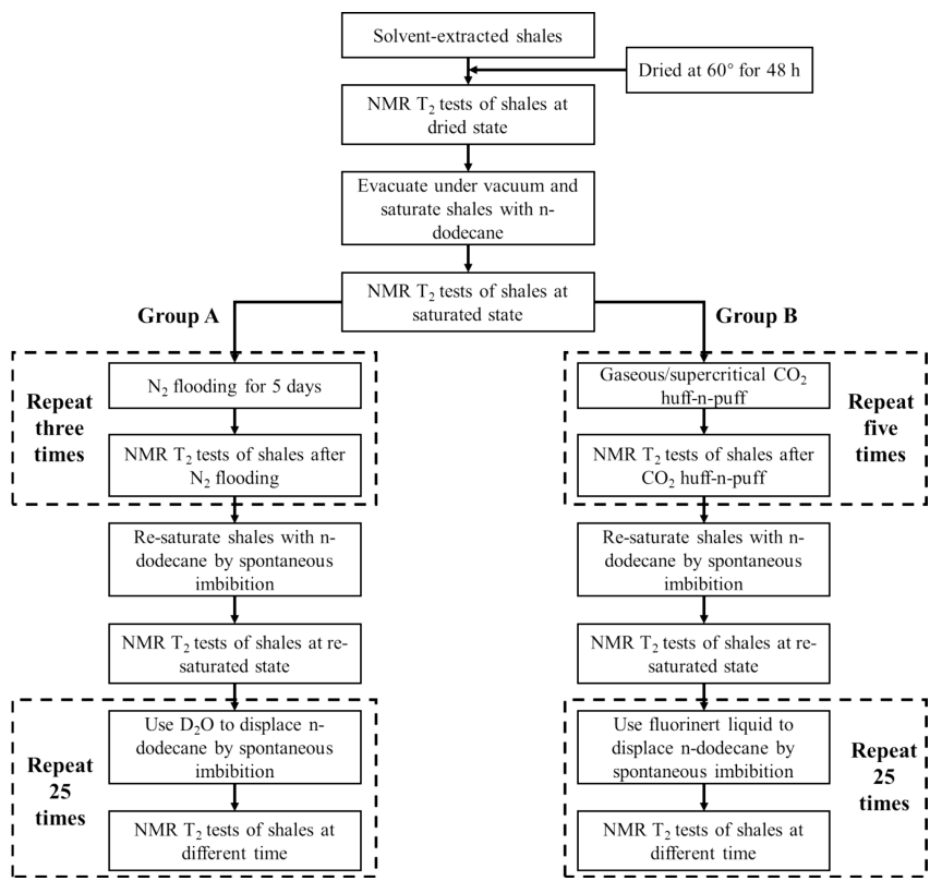 目前,页岩油的采收率依然很低。本次研究采用了核磁共振技术(NMR),开展了高速离心、氮气驱替、二氧化碳吞吐、自发渗吸等实验,评价了不同方法下的页岩可动油比例和分布,并阐明了页岩油的可动机理。结果表明,氮气驱替的可动油比例最低,二氧化碳吞吐和自发渗吸对页岩油的动用能力较高。不同方法中的裂隙和基质孔隙的可动油比例及动用顺序不同,在高速离心、氮气驱替和二氧化碳吞吐实验中,裂缝中的油比基质孔隙中的油更易移动,而在自发渗吸实验中,基质孔隙中的油首先驱替至裂缝中,然后再排出页岩,因此导致裂缝的可动油比例较低。天然裂缝和实验过程中产生的人为裂缝会显著增加页岩油的可动比例。自发渗吸和二氧化碳吞吐的协同应用是提高水力压裂后页岩采收率的最佳策略。本研究不仅提高了对页岩油可动性的认识,也为制定页岩油开发策略提供了思路。