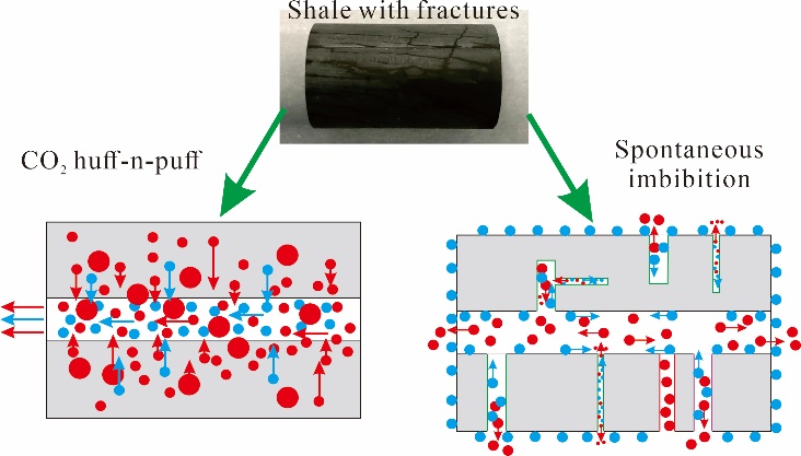 图2 二氧化碳吞吐和流体自发渗吸的驱油机理及差异