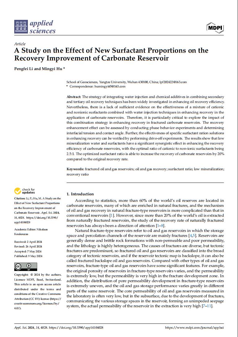 bevitor伟德2021级硕士生李鹏飞在期刊《Applied Sciences》上发表了题为“A Study on the Effect of New Surfactant Proportions on the Recovery Improvement of Carbonate Reservoir”的研究论文。bevitor伟德为论文第一署名单位,李鹏飞为第一作者,其导师胡明毅教授为该文通讯作者。