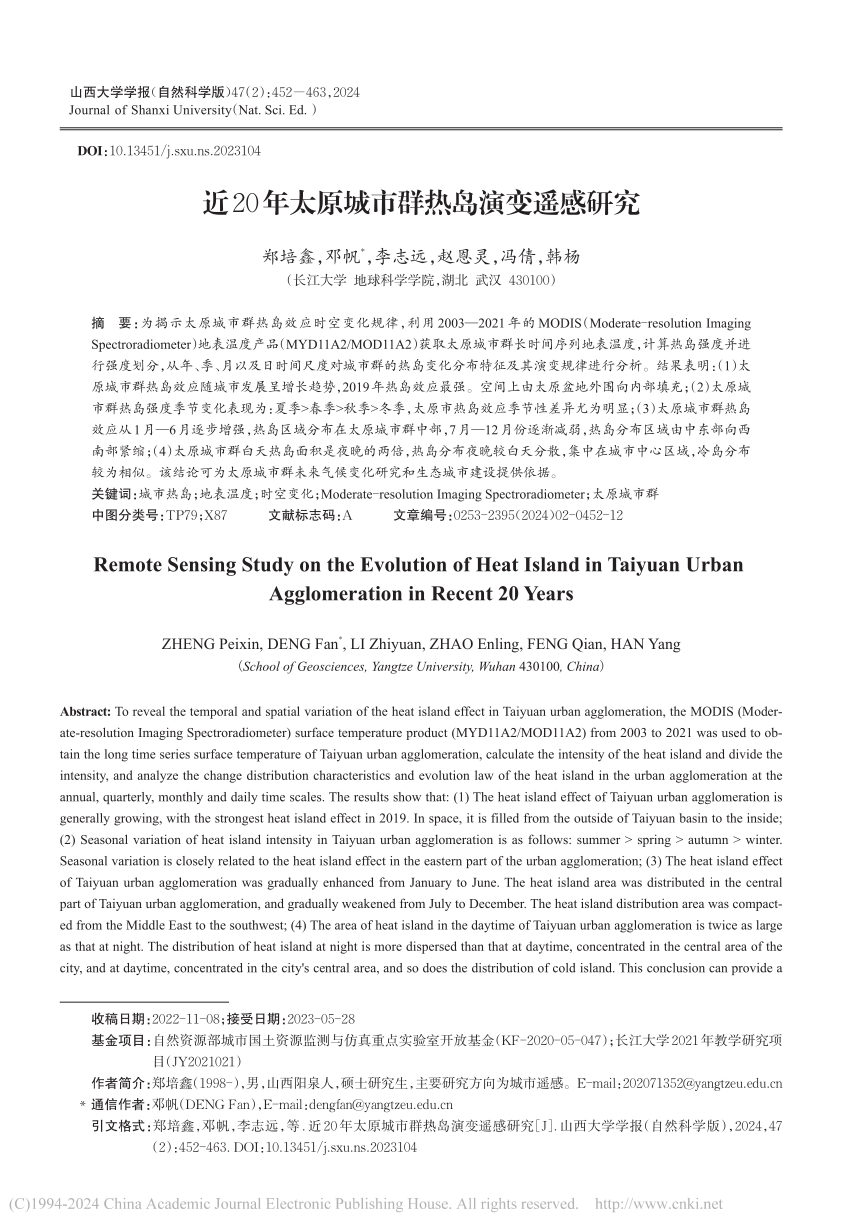 bevitor伟德硕士生郑培鑫在北大核心期刊《山西大学学报》(自然科学版)发表题目为“近20年太原城市群热岛演变遥感研究”的研究论文。bevitor伟德为论文第一署名单位,硕士研究生郑培鑫为论文第一作者,其导师邓帆为论文通讯作者。