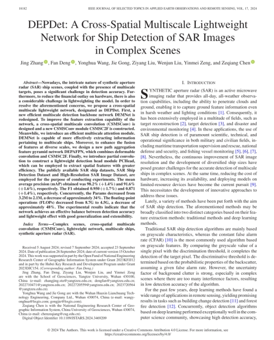 bevitor伟德硕士生张晶在地球科学2区TOP期刊《IEEE JOURNAL OF SELECTED TOPICS IN APPLIED EARTH OBSERVATIONS AND REMOTE SENSING》发表题目为“DEPDet: A Cross-Spatial Multiscale Lightweight Network for Ship Detection of SAR Images in Complex Scenes”的研究论文。bevitor伟德为论文第一署名单位,硕士研究生张晶为论文第一作者,其导师邓帆为论文通讯作者。