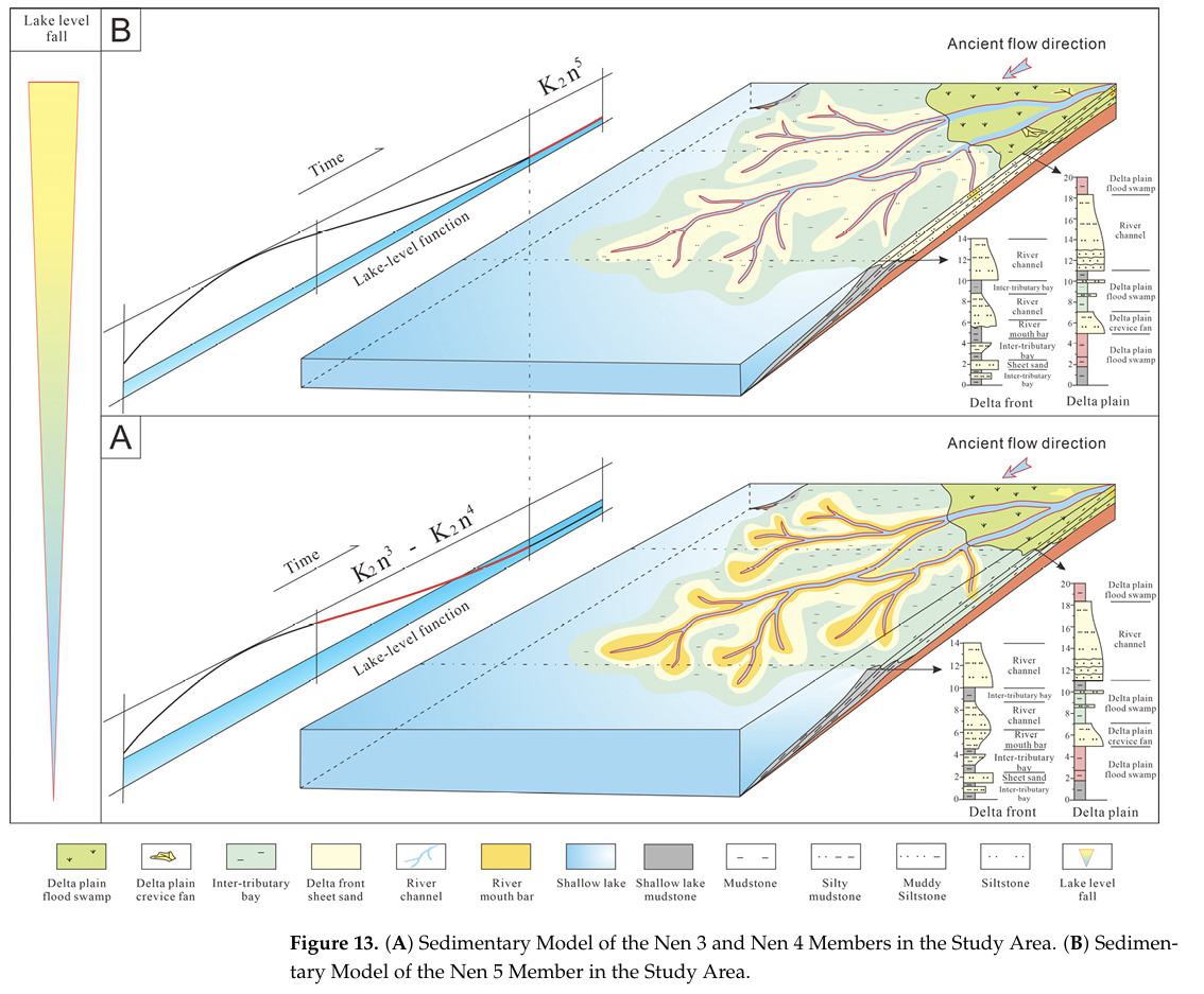图1 (A)研究区嫩三段和嫩四段沉积模式图;(B)研究区嫩五段沉积模式图