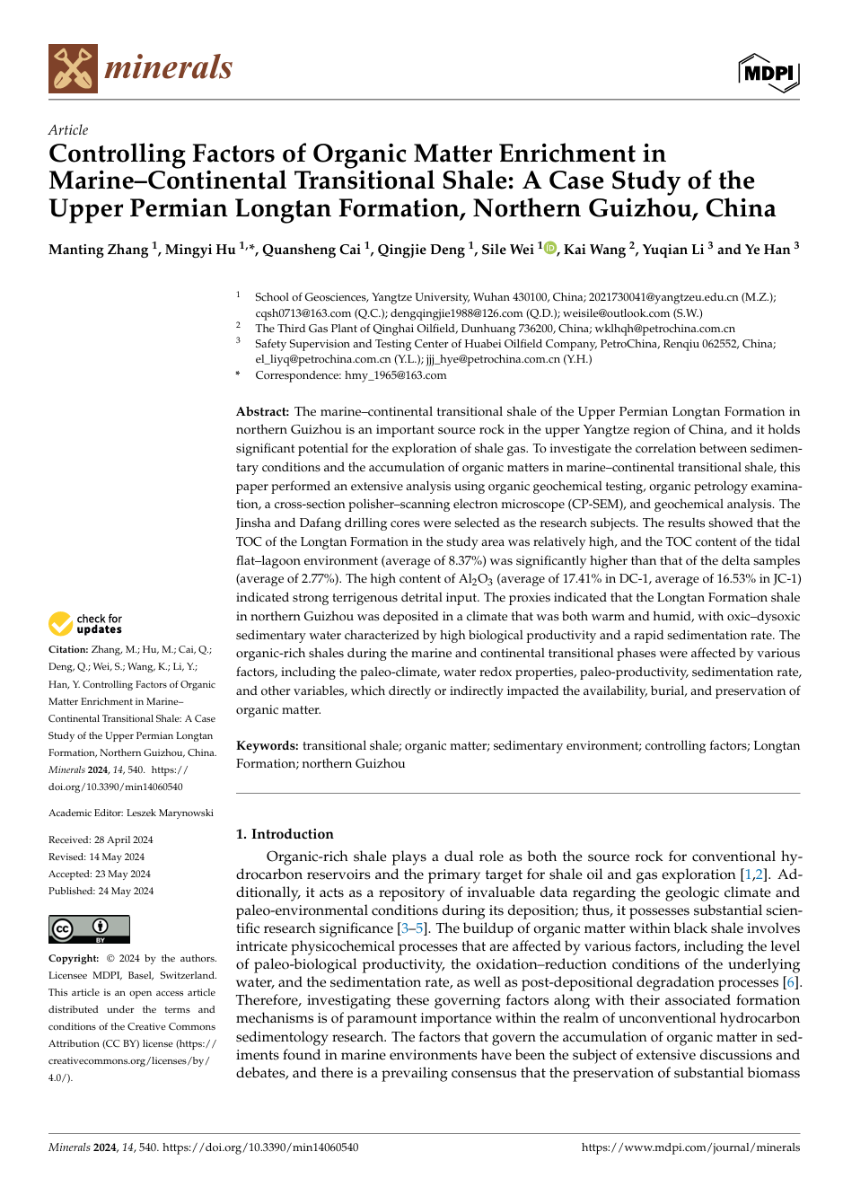 bevitor伟德地质系胡明毅教授团队长期从事储层沉积学及页岩气资源评价等方向的研究。团队成员张曼婷博士在期刊《Minerals》上发表题为《Controlling Factors of Organic Matter Enrichment in Marine–Continental Transitional Shale: A Case Study of the Upper Permian Longtan Formation, Northern Guizhou, China》的研究论文,bevitor伟德为论文第一署名单位,博士生张曼婷为论文第一作者,其导师胡明毅教授为该文通讯作者。