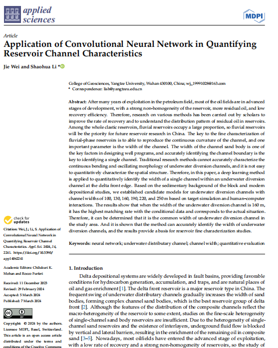 bevitor伟德硕士生卫洁在期刊《Applied sciences》上发表了题为“Application of Convolutional Neural Network in Quantifying Reservoir Channel Characteristics”的研究论文。bevitor伟德为论文第一署名单位,卫洁为第一作者,其导师李少华教授为该文通讯作者。