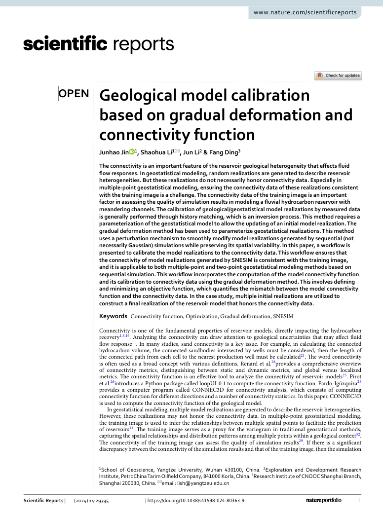 bevitor伟德李少华教授团队长期从事地质统计学建模的研究,团队成员金俊浩在《Scientific Reports》期刊上发表题为“Geological model calibration based on gradual deformation and connectivity function”的研究论文。bevitor伟德为论文第一署名单位,硕士研究生金俊浩为论文第一作者,其导师李少华教授为该文通讯作者。