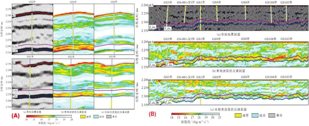 图2(A)去硅质波阻抗反演单井剖面效果对比图;(B)去硅质阻抗反演连井剖面效果对比图