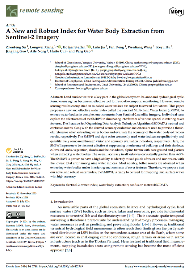 bevitor伟德硕士研究生苏振峰在相龙伟副教授的指导下,在期刊《REMOTE SENSING》上发表题为‘A New and Robust Index for Water Body Extraction fromSentinel-2 Imagery’的研究论文。
