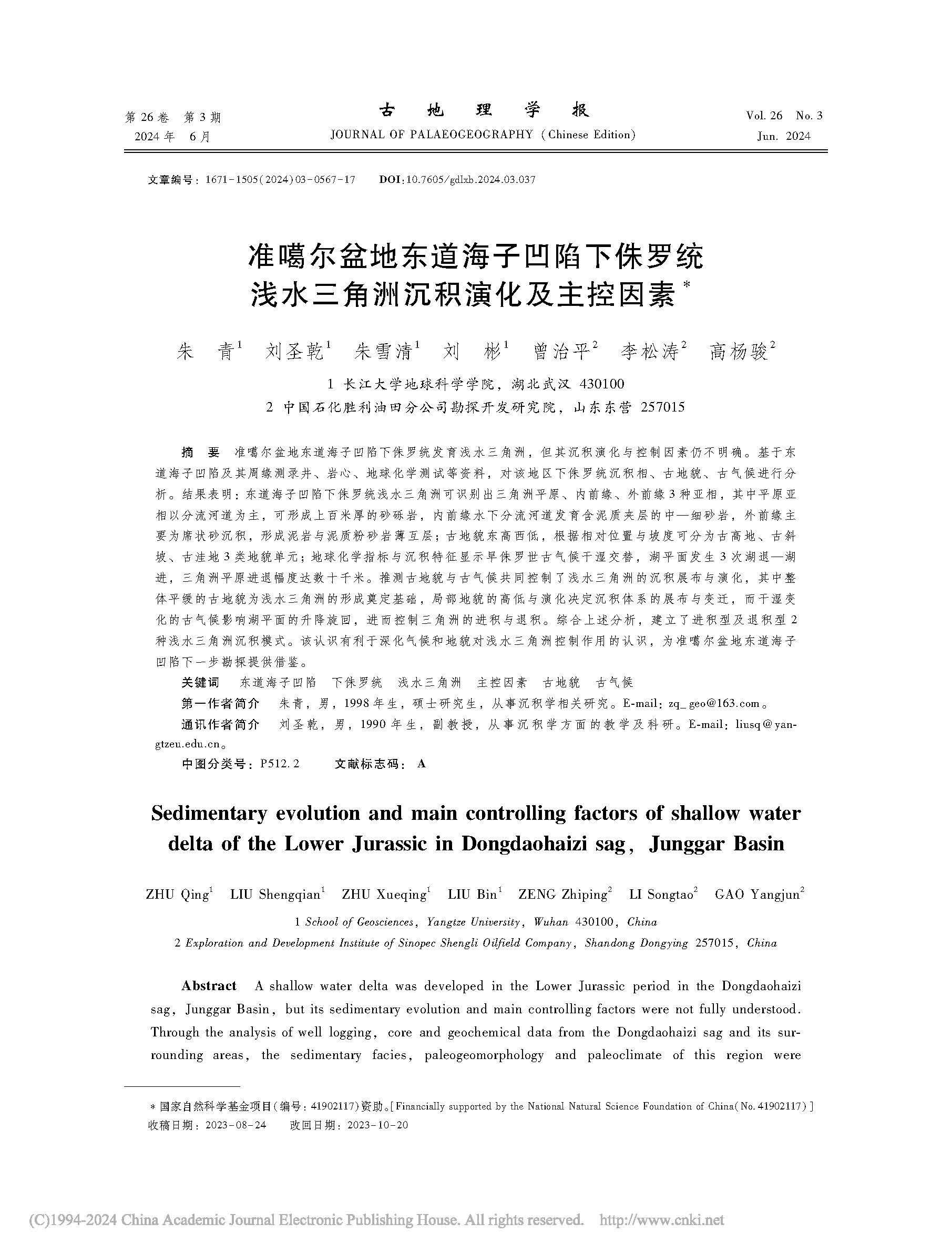 bevitor伟德地质学专业22级硕士研究生朱青、朱雪清等在《古地理学报》上发表题为“准噶尔盆地东道海子凹陷下侏罗统浅水三角洲沉积演化及主控因素”的研究论文。bevitor伟德为论文第一署名单位,研究生朱青为论文第一作者,刘圣乾副教授为论文通讯作者,论文得到了国家自然科学基金项目的资助。