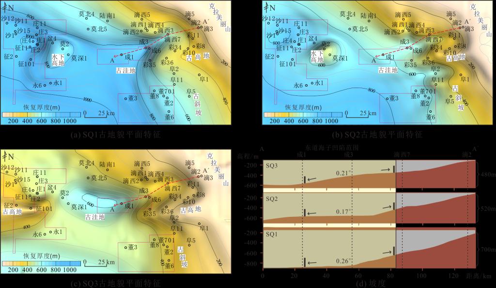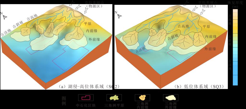 浅水三角洲广泛发育于陆相湖泊环境,是目前油气勘探研究的热点。该研究选取东道海子凹陷下侏罗统八道湾组及三工河组广泛发育的浅水三角洲为研究对象,基于东道海子凹陷及周缘大量测录井、岩心、地球化学测试等资料,利用残余地层厚度法,并结合去压实校正的方法恢复古地貌(图1),对沉积相、古地貌、古气候及相互作用进行了综合研究,并建立了古地貌与古气候共同控制的浅水三角洲的沉积展布与演化模式。