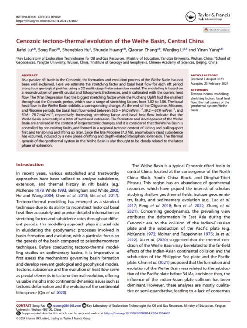 公司硕士生芦佳飞在国际知名地学期刊《International Geology Review》上发表了题为“Cenozoic tectono-thermal evolution of the Weihe Basin, Central China”的研究论文,系统揭示了渭河盆地新生代以来构造-热演化过程。BEVITOR伟德为论文第一署名单位,芦佳飞为第一作者,导师饶松教授为通讯作者。