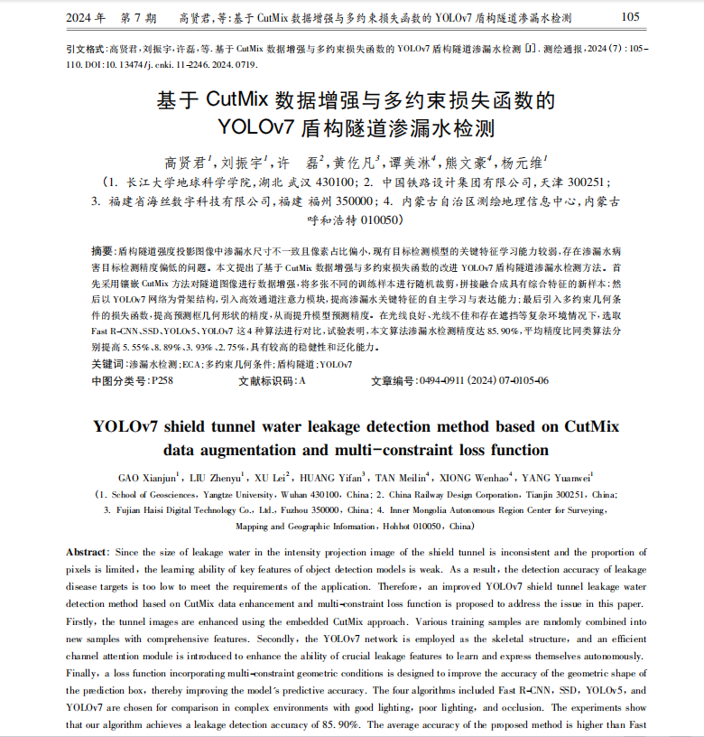 bevitor伟德地信系高贤君老师在测绘领域主流期刊《测绘通报》上发表题为“基于Cutmix数据增强与多约束损失函数的YOLOv7盾构隧道渗漏水检测”的研究论文。