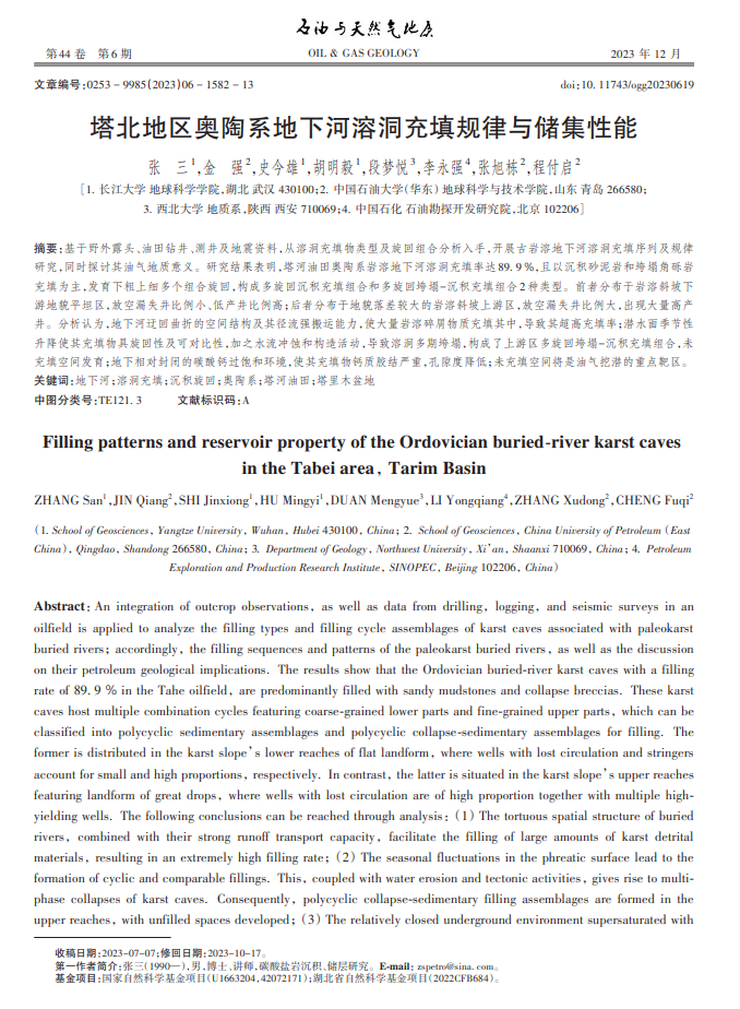 bevitor伟德地质系张三博士在《石油与天然气地质》期刊发表题为“塔北地区奥陶系地下河溶洞充填规律与储集性能”的研究论文。