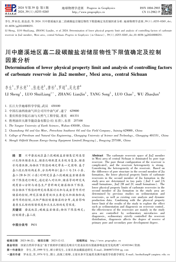 bevitor伟德石油系硕士生李生同学在公司罗水亮副教授的指导下,在地球物理学领域期刊《地球物理学进展》上发表题为“川中磨溪地区嘉二段碳酸盐岩储层物性下限值确定及控制因素分析”的研究论文。