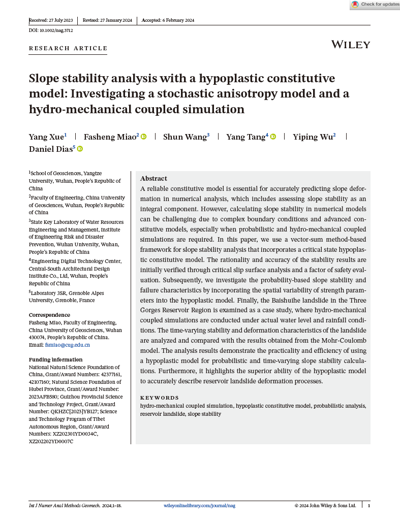 bevitor伟德地质系教师薛阳博士以第一作者身份在计算机岩土领域老牌期刊《International Journal for Numerical and Analytical Methods in Geomechanics》上发表题为“Slope stability analysis with a hypoplastic constitutive model: investigating a stochastic anisotropy model and a hydro-mechanical coupled simulation”的论文。本项研究得到了国家自然科学基金项目和西藏自治区科技项目的资助。