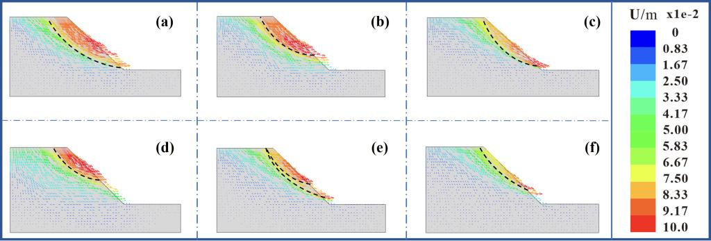 图2 不同网格尺寸下边坡的滑面分布、边坡位移场的分布特征
