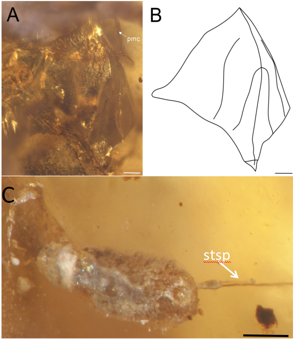 (C)叠瓦翼蜡蝉的触角,stsp= second tubular sensory process,第二管状感觉突,比例尺=0.1mm。